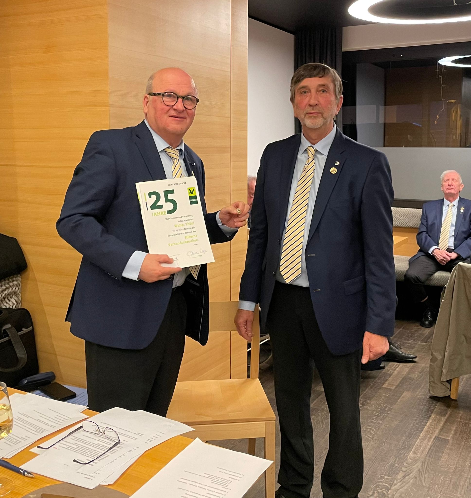 Walter Thöni (li) erhält das silberne Ehrenabzeichen des Chorverband Vorarlberg